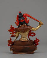 Manjushri, the Bodhisattva of Wisdom, is adored by Buddhists as the embodiment of insight, understanding, and clarity. This 14cm tall and 12cm broad handcrafted statue is made of oxidized copper and embellished with gold plating and delicate acrylic painting to highlight the sacred figure's fine nuances. Manjushri is known for wielding the blazing sword of wisdom, which cuts through ignorance and lights the road to enlightenment.