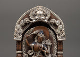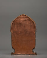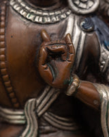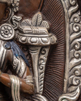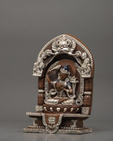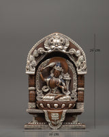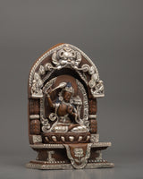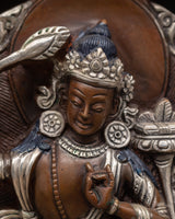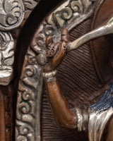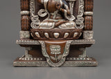 This figure with throne is made of oxidized copper and plated in silver. This statue's exquisite throne is adorned with subtle silver-plated details that reflect traditional Tibetan artistry. Surrounded by floral motifs and celestial decorations, the throne adds to the statue's overpowering spiritual presence. Whether displayed in your house, temple, or given to someone in need of knowledge, this statue serves as a continual reminder of the way to enlightenment. This intricate sculpture, created by outstanding Nepalese artisans, is suitable for altars, meditation places, or as a meaningful décor piece for anyone looking to increase awareness in their daily lives.