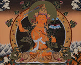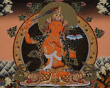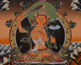 This hand-painted artwork of Manjushri, Chengrezig, and Vajrapani is a spiritual and artistic masterpiece that can elevate any space. It is a focal point of tranquility, wisdom, and inspiration and makes a thoughtful gift for loved ones. The painting carries deep symbolic significance and artistic beauty, making it perfect for those on a spiritual journey. This thangka infuses your space with the timeless virtues of wisdom, compassion, and power.