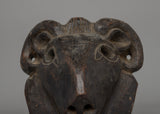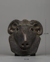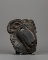 The mask for decor is a beautifully handcrafted wooden piece measuring 22 cm tall and 20 cm wide. It represents an animal's intense and wild spirit, likely a ram. The artist's skill is evident in the detailed carvings, especially the curved horns on each side of the face. These horns are carefully shaped to resemble real ones, giving the mask a bold yet elegant look. The horns are the main attraction, instantly drawing the viewer’s eye.