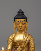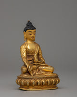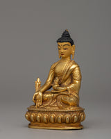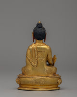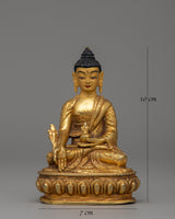 The Medicine Buddha statue, made from copper and gold-plated, stands at a height of 10 cm, with a width of 7 cm, and weighs 0.29 kg. The Buddha is depicted in a seated position, symbolizing meditation and healing. In his right hand, he holds a myrobalan plant, symbolizing the ultimate cure for both physical and spiritual ailments, while his left-hand holds a healing nectar bowl, representing the offering of healing to all beings. This imagery highlights the Medicine Buddha's role as a compassionate healer.