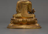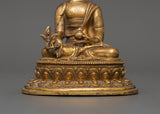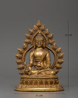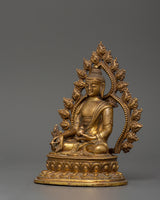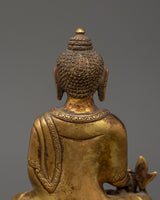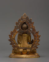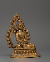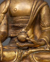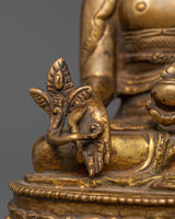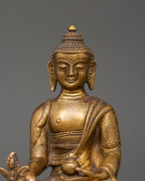 This gorgeous statue of the Medicine Buddha made of copper is a stunning representation of recovery, tranquility, and spiritual awakening. It is 15 cm in height and 11 cm in width, and it depicts the Buddha of Healing, the admired Tibetan deity Bhaisajyaguru, sitting in a state of calm meditation. This statue, which is made of a copper body and has a shining layer of gold plating on it, has a serene presence that makes it perfect for altars, places of worship, or settings that emphasize well-being.