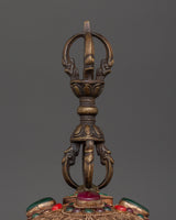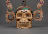 Enhance your home with this stunning Mystic Skull Decor, a handcrafted masterpiece made of copper with silver plating and inlaid with brilliant coral, turquoise, and crystal stones. This unique spiritual home accent combines sacred meaning with vivid artwork, making it an effective piece for collectors and home décor enthusiasts. This skull, which measures 27cm in height and 27cm in width, is topped with a vajra symbol, an old Tibetan Buddhist emblem of force and spiritual awakening. The skull's shape is further enhanced by two prominent, stylized ear patterns that are abundantly embellished with brilliant inlays of coral and turquoise, giving it a boho-tribal charm.
