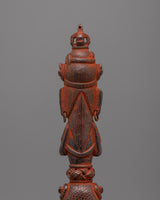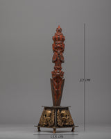 The Mystical Tibetan Ritual Phurba is a superb piece, made of durable brass with an antique finish and supported by a solid iron base. Standing 32 cm tall and 13.5 cm wide, this Phurba weighs 1.44 kg and represents the ideal balance of form and function. Its elaborate design and strong materials reflect its high regard in Tibetan Buddhist rituals, where it is used as a sacred tool to expel negativity and protect against spiritual harm.