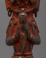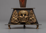 The Phurba has a handle with three wrathful deity faces that represent the victory of ignorance, desire, and hatred while projecting protecting energies. Below the faces, a central knot signifies the unification of wisdom and method, with hands in a prayer or offering gesture to reflect dedication. The three-edged blade represents cutting through the three poisons of ignorance, desire, and aversion, while the iron base, decorated with skull images, stresses impermanence and the transformation of negativity into spiritual growth, combining artistry with profound symbolic meaning. This Phurba is used in tantric practices to channel divine energy, which helps practitioners overcome barriers, eradicate evil, and achieve spiritual clarity. Its rich meaning and careful craftsmanship make it an essential and inspiring piece for anyone seeking spiritual enlightenment.