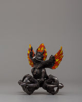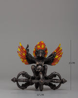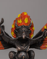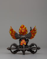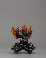 This mythical bird-like deity, Garuda, is crafted from oxidized copper and stands 9 cm tall by 10 cm wide. This figure depicts Garuda in flight above the double vajra, its wings outstretched, conveying a sense of motion and power. The wings are artistically painted with vibrant orange and yellow acrylic colors to resemble flames, emphasizing the creature's fiery energy and majestic nature. The contrast between the vibrant colors of the wings and the dark oxidized copper body adds depth and dimension to the piece, making it both elegant and intense.