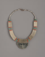 The necklace comprises small turquoise and coral beads, with decorative silver-plated detailing adding to the overall texture. Its 23 cm length makes it a substantial accessory that fits comfortably around the neck, while its 6 cm width makes it stand out, highlighting the face and collarbone area. The design incorporates traditional motifs, providing a spiritual touch that is culturally significant. The artificial stones are carefully placed within the silver-plated frame, resulting in a polished and finished appearance that exudes sophistication.