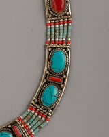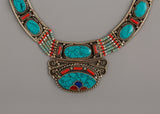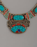 This necklace is a stunning piece of craftsmanship made of copper and silver plating with vibrant turquoise and coral artificial stones. The necklace's traditional and bold design has oval turquoise stones and contrasting red coral settings arranged symmetrically. The central pendant features a larger turquoise stone in the center, surrounded by smaller pieces of coral and turquoise for added balance and beauty. The intricate silver-plated beads interspersed among the rocks add to the overall visual harmony of the piece.