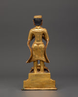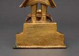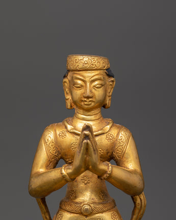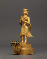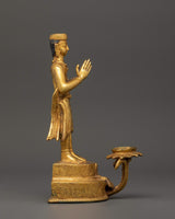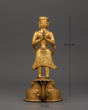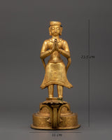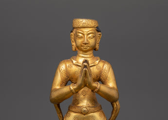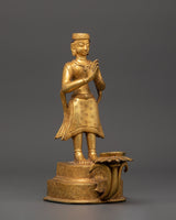 This gorgeous Newari Sculpture with Oil Lamp stands 19cm tall and 14cm wide. Its copper body is elegantly gold-plated to exude elegance and holiness. This figure, weighing 1.33kg, exemplifies Newari creativity by portraying intense dedication with a prayer motion and a working lotus-shaped oil light at its base.