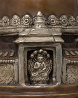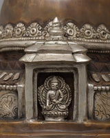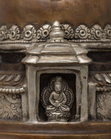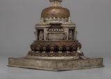 The Sacred Traditional Newari Style Stupa is precisely handcrafted on an oxidized copper body and plated with silver, demonstrating the great skill of Newar artisans. This stupa, which stands 30.5 cm tall, 21.5 cm wide, and weighs 4.04 kg, represents both elegance and spiritual regard. Its strong materials assure endurance, and the silver plating emphasizes its sanctity, making it an ideal centerpiece for any ritual or spiritual environment. In Buddhist practice, stupas are revered as sacred structures that represent enlightenment and the Buddha's teachings, and they are frequently used as centers of meditation and devotion.