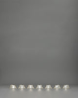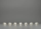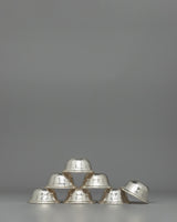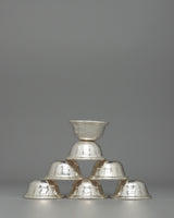 This set of seven offering bowls for the shrine is made from copper with a silver-plated finish, giving it a refined and elegant look. Each bowl is 4 cm in height, 8.5 cm in diameter, and 3.5 cm in depth, arranged in a symmetrical formation. The design features a pentagon-shaped pattern carved on each bowl, adding a unique and visually appealing touch. The combination of copper and silver plating gives the bowls a sacred feel, making them ideal for water offerings and other spiritual rituals.