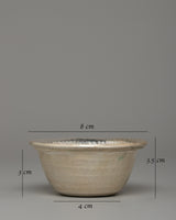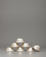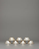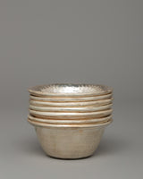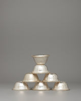 Bowl Set for Altar, handcrafted from copper and plated with shimmering electro silver. This collection of seven ritual bowls is intended for traditional Tibetan Buddhist water offerings, with each bowl representing generosity and purity. They are 3.5cm in height and 8cm in diameter, with a 4cm base and 3cm inner depth, making them ideal for altar ceremonies or meditation practice.