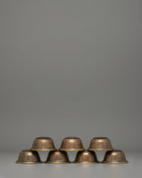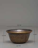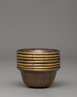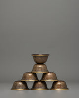 This Tibetan Offering Bowl Set consists of seven copper and brass embellishments. Each bowl is 4 cm high and 7.5 cm in diameter, with deliberate proportions for daily puja rituals, altar places, and symbolic water offerings. The 3.5 cm inner depth provides ample area for significant offerings, and the 4.5 cm base makes the bowls solid on any altar structure.