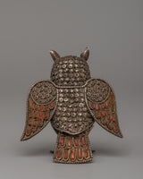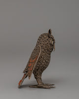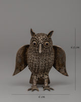 The Owl Statue, made from copper with silver plating, stands at 6.5 cm in height and 6 cm in width and weighs 0.048 kg. This exquisite statue showcases intricate craftwork that brings the owl to life. The craftsmanship is evident in its large eyes' detailed design, giving it an intense yet captivating gaze. The owl’s ears, wings, feet, and beak are carefully sculpted, adding to the statue’s lifelike quality.