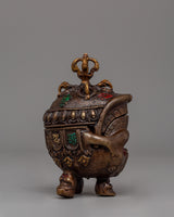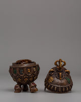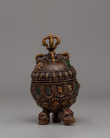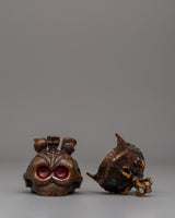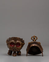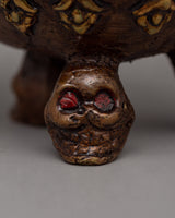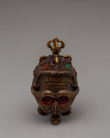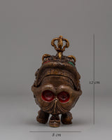 Measuring 12 cm in height and 8 cm in width, this oxidized brass symbolic skull weighs 0.56 kilograms. Its small size and intricate design make it an essential element of religious rituals or an intriguing decoration. The aged finish and finely carved details of the skull represent the rich spiritual and cultural traditions of Tibetan Buddhism.