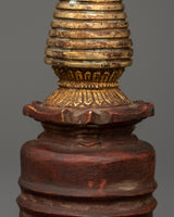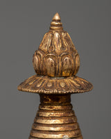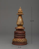 The oxidized copper and gold-plated elements showcase exceptional craftsmanship and meticulous attention to detail, ensuring the stupa's lasting beauty. It is a reminder of the Buddha's teachings and the importance of peace, wisdom, and enlightenment. Its antique finish contributes depth and character, making it an excellent choice for any sacred altar or spiritual area.