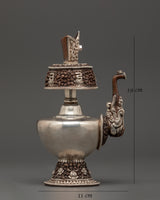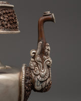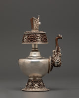 Standing 19 cm tall and elegant, this exquisitely designed Oxidized Copper Water Vase Bhumba set has a silver-plated body. Each vase, which has been used for centuries in Tibetan Buddhist ceremonies, represents wisdom, purification, and the flow of divine blessings. Inspired by old Himalayan creativity, the peacock-neck spout and elaborate floral engravings make these sculptures perfect for home altars, empowerment ceremonies, and temple rituals.
