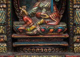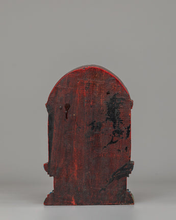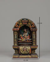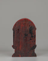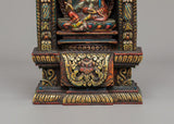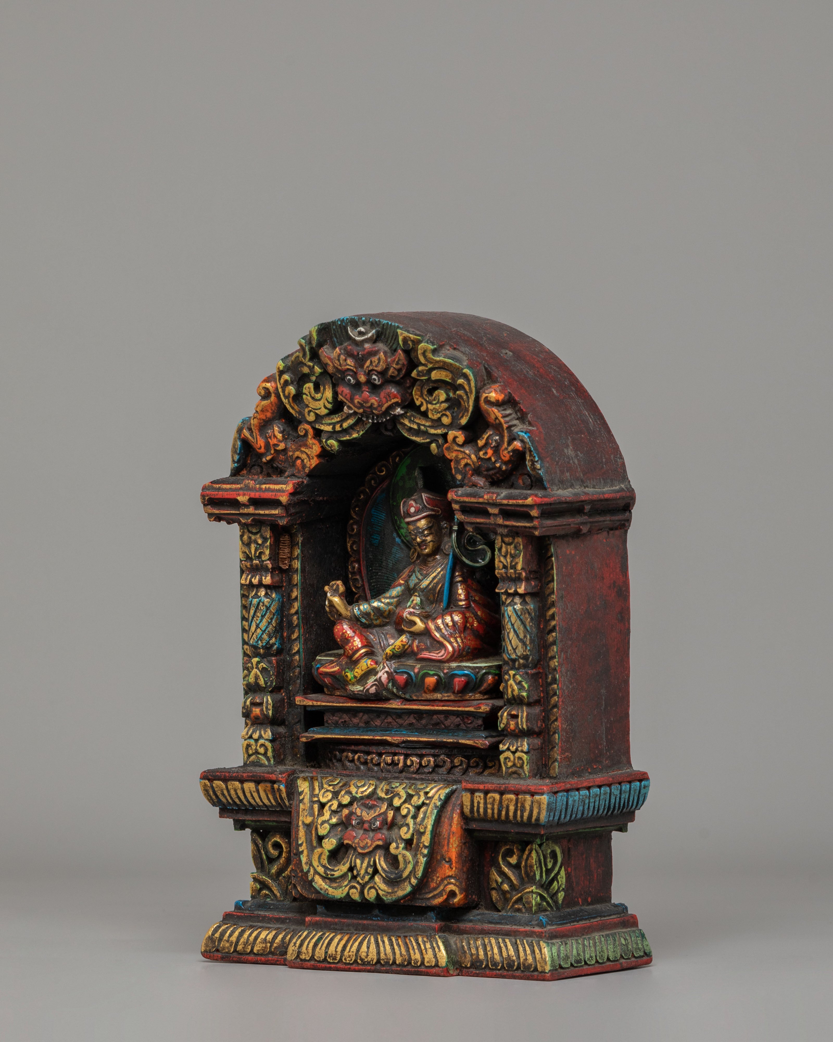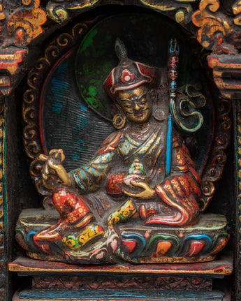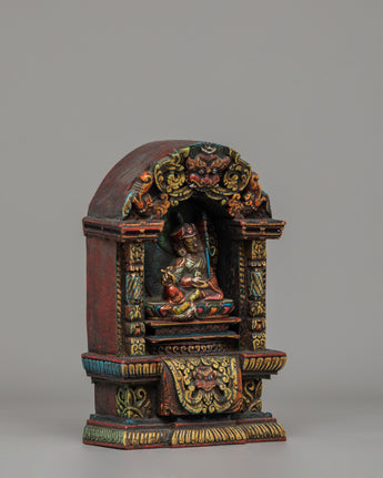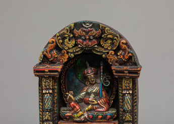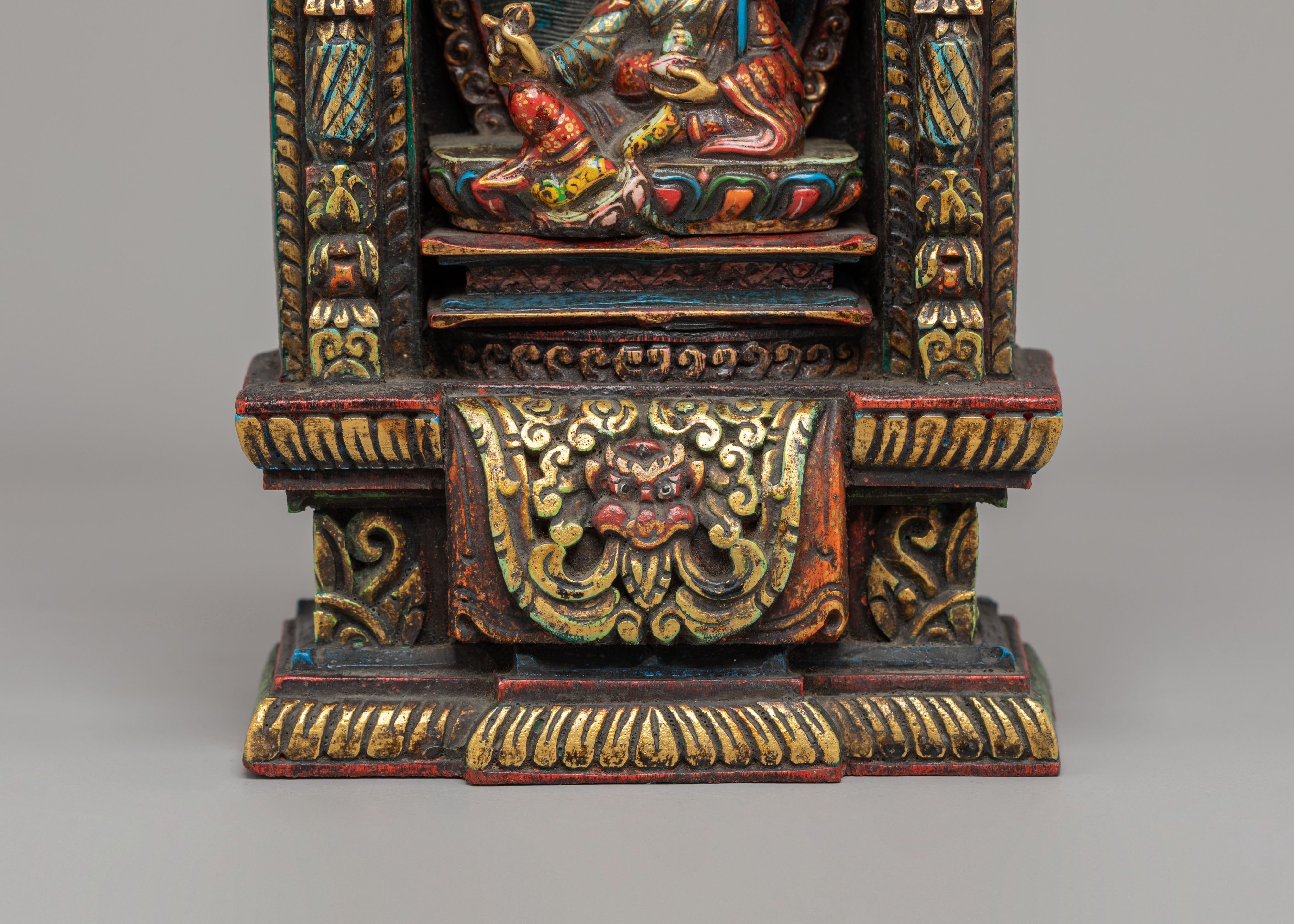 The wooden altar features ornate carvings inspired by classical Himalayan temple architecture. Decorative patterns, lotus motifs, and mythical guardians emphasize protection, wisdom, and spiritual transformation—the core teachings associated with Guru Rinpoche. The rich palette of reds, blues, greens, and gold accents enhances the statue’s visual depth, showcasing a handcrafted finish that brings out both texture and luminosity. This makes the piece ideal for meditation spaces, altar setups, or as a meaningful statement piece in a spiritually inspired home.