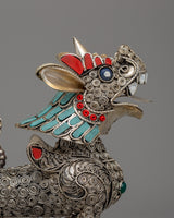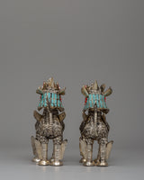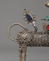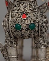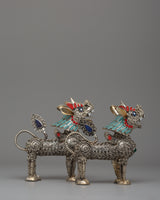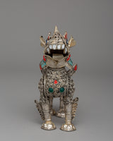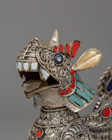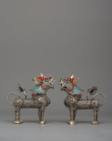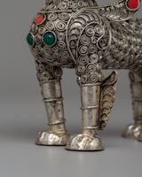 These lion sculptures are further enhanced by the addition of artificial turquoise, coral, and lapis lazuli stones, which provide a brilliant contrast against the polished silver body. The ornate decorations on their manes, tails, and legs highlight their precise workmanship and cultural value. The ensemble weighs 0.320 kg, making it an oversized yet reasonable display item. Whether displayed in a house, temple, or personal collection, this stunning pair represents protection, wealth, and spiritual guardianship, making it an exceptional ornamental treasure for people who admire Buddhist and Himalayan art.