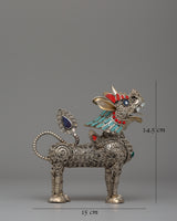 The Handcrafted Pair of Lion Statues is a breathtaking example of traditional Tibetan creativity, with highly detailed craftsmanship. These beautiful lion sculptures are made of white metal and have a silver polish finish. They emit an atmosphere of power, protection, and divinity. Each statue is 14.5 cm tall and 15 cm wide, making it a striking addition to any religious area or collection. The lions are artistically embellished with flowing filigree designs, adding to their majestic appeal. Their expressive features, including wide mouths and ferocious expressions, reflect their function as guardians in Buddhist culture, representing power and knowledge and removing bad energy.