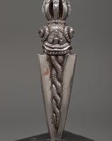 The Phurba, or ritual dagger, is valued for its symbolic ability to suppress bad energies, remove spiritual impediments, and anchor heavenly attention. Its three-edged blade symbolizes the transcendence of ignorance, desire, and hatred. This Phurba dagger is ideal for shrine placement, altar work, or contemplative rituals, serving as a conduit for protection, cleansing, and spiritual transformation.