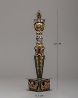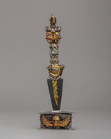 The Phurba sits on an elaborate pedestal adorned with patterns representing harmony and the interconnectedness of all things. These decorative elements represent balance and the ability to create order out of chaos. The fine inlays and overall structure elevate this Phurba from a spiritual tool to a one-of-a-kind piece of Tibetan art that combines craftsmanship, cultural significance, and purpose.