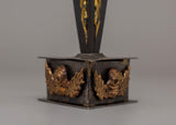 This Phurba Tibetan Buddhism artwork is Carefully detailed and measures 20 cm tall by 6.5 cm wide. It has iron, copper, silver, and brass inlays, reflecting its importance as a ritual tool in Tibetan Buddhism. Silver and brass inlays add a unique touch to the design, as these metals frequently represent purity, spiritual energy, and transformation. Combining these elements strengthens Phurba's sacred role in spiritual practices, where it is used to break attachments and overcome obstacles.