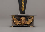 The central figure at the top of the Phurba represents a deity with three faces, each with a powerful expression. The three eyes represent the ability to see beyond ordinary perception, a critical component of spiritual awakening. The detailed headdress on the central figure represents divine wisdom and protection, essential for the Phurba's role during rituals. The dagger's shaft is embellished with intricate designs that evoke strength and the ability to overcome worldly distractions.
