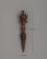 This intense spiritual weapon, which measures 17.5 cm in height by 3.5 cm in width and weighs 0.20 kg, is utilized in meditation, tantric ceremonies, and energy healing. The triple-edged blade eliminates ignorance, attachment, and hatred, making it an essential tool in Buddhist ceremonies and personal spiritual practices.