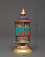 Weighing only 0.15 kg, this prayer wheel is lightweight. At the same time, the vibrant gemstone inlays, turquoise, coral, and lapis lazuli are known for their healing properties, contributing to the positive atmosphere in your meditation space. As you turn the wheel, the sacred sounds and vibrations foster focus, making this prayer wheel an effective tool for enhancing your practice and promoting calm and tranquility.
