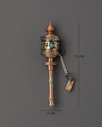 This small copper prayer wheel is wonderfully crafted, a spiritual buddhist altar tool. It is just 7.5cm in height and 2cm in breadth, weighing 0.008kg, and is designed for portability and ease of use. Its copper and brass body, embellished with a turquoise stone inlay, possesses both spiritual significance and ornamental beauty, making it an excellent choice for personal spiritual rituals or as a thoughtful gift.