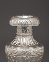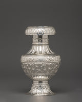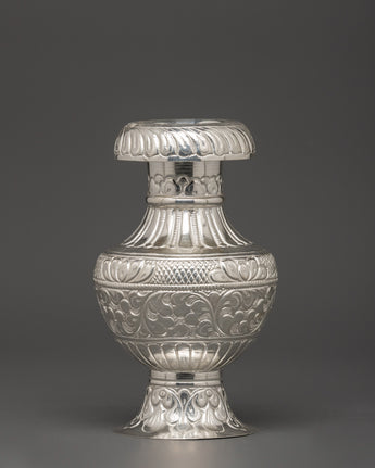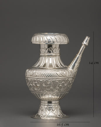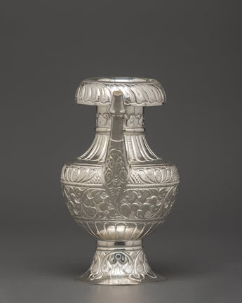 This stunning Pure Silver Karuwa with Floral Engraving is a sacred vase used in Tibetan Buddhist rituals. It is skillfully made of silver and has elaborate flower engravings. It also has a powerful form with a large, rounded body and a gracefully designed spout. This Karuwa, 14 cm tall and 16.5 cm wide, is a ceremonial object and an elegant symbol of cultural regard.