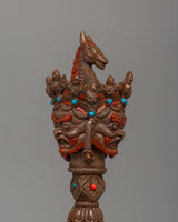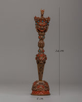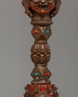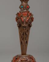 The shaft of the Phurba is adorned with intricate details, demonstrating the exceptional craftsmanship of Tibetan artisans. The base is stable, firmly supporting the dagger while serving as a powerful purification tool. The vibrant colors of the stones contrast with the oxidized copper body, adding to the Phurba's commanding presence. This piece is functional ritual art and a symbol of sacred protection, making it a prized possession for any practitioner.