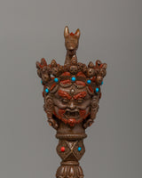 This exquisite purification dagger Phurba measures 24 cm in height and 6 cm in width and is expertly crafted from oxidized copper. The oxidized finish adds charm and boosts the piece's spiritual energy, making it compatible with traditional Tibetan Buddhist practices. The Phurba, a ceremonial dagger, is important in rituals because it represents cutting ties with negativity and illusion, allowing purification and transformation.