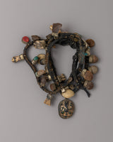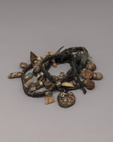 This Rakshya Mala Beads Necklace, 50cm long with a 4cm locket, is a genuine Tibetan spiritual adornment thought to bring protection, strength, and guidance. This mala is a potent amulet with significant spiritual meaning, made from 32 sacred components like coins, semi-precious stones, teeth, bones, and seeds. It has traditionally been used by monks and spiritual practitioners to protect against negative energy and improve meditation activities. This unique relic embodies generations of Buddhist history and sacred meaning, whether worn as a prayer bead necklace or a protection charm.