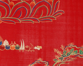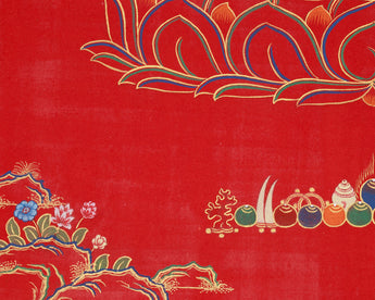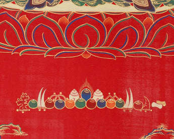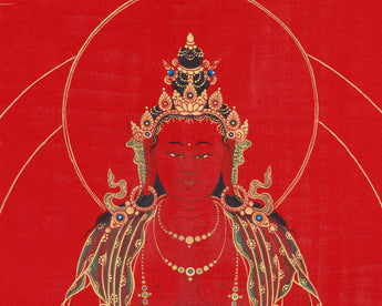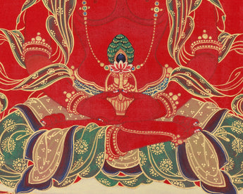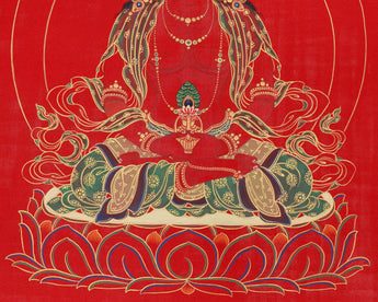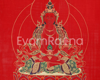 Elevate your space with the Red Amitayus Thangka Giclee Canvas Print, a striking piece that captures the Buddha of Infinite Life in a vibrant red hue. This exquisite artwork symbolizes vitality, compassion, and longevity, featuring Amitayus in a serene meditative posture with the vase of immortality. The vivid red tones and intricate details of the Thangka bring both spiritual significance and visual splendor to any room, making it a perfect focal point for meditation spaces or spiritual retreats.
