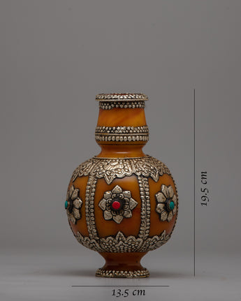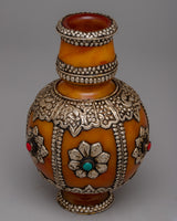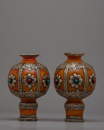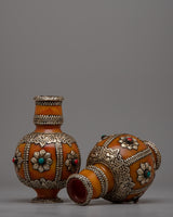 Our set of resin flower vases, carefully made on a resin body with stunning pure silver inlay, will add everlasting elegance to your home decor. These two vases provide a striking visual that enhances any room by fusing traditional elegance with modern craftsmanship. They weigh 0.904 kg altogether and are elegant and solid, making them ideal for holding your most prized flowers or for use as eye-catching standalone decorations.
