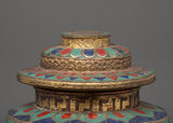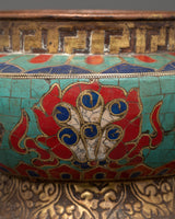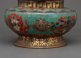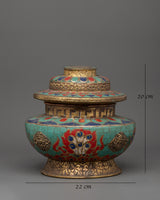 This rice pot offering is a sacred Tibetan ritual vessel made of copper and adorned with turquoise, coral, and lapis lazuli. The copper body ensures a timeless look, while the precious stones add spiritual significance to this offering jar. The turquoise symbolizes protection and healing, the coral enhances life force, and the lapis lazuli fosters knowledge and spiritual insight. Its appealing design serves religious purposes and serves as a spiritual decor element.