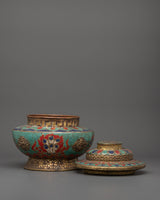 This sacred rice pitcher, measuring 20 cm in height and 22 cm in width, is perfect for Buddhist ceremonies and spiritual sacrifices. The creative inlays and exceptional craftsmanship make it a unique addition to any altar, enriching your practice's visual and spiritual dimensions. This Rice Pot Offering is ideal for those seeking to incorporate ancient Buddhist rituals into their home or meditation space. It signifies abundance and gratitude. This ritual item is essential for ceremonial offerings or as part of a spiritual tradition.
