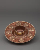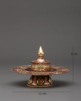 This handcrafted ritual incense holder, made from copper and brass, weighs only 0.100 kg. It is 8 cm tall and has a 12 cm base. The holder's design is highly spiritual, making it a beautiful addition to any altar or sacred space. At the top, a mantra carved around the circumference gives the incense holder a deep spiritual resonance. This mantra, often inscribed to bring blessings or protection, enhances the sacred ambiance when incense is burned.