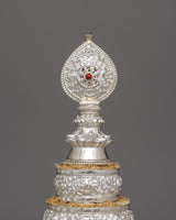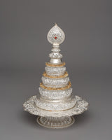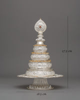 In Tibetan Buddhism, a mandala is a symbolic picture of the universe made up of concentric circles and geometric patterns that express the harmony and interconnection of everything. This silver mandala offering set is elaborately carved with traditional Buddhist designs, which add to its spiritual significance and aesthetic appeal. The multi-tiered structures depict the sacred Mount Meru, the legendary center of the Buddhist universe, with each layer representing the many stages of enlightenment and the journey to ultimate wisdom. The elegant crown at the top is embellished with intricate motifs and a valuable red gemstone, which represent the radiance of awakened consciousness and the essence of spiritual development.