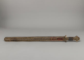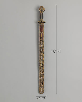 Its intricate brass inlays display beautiful designs that emphasize its ceremonial significance, reflecting traditional Tibetan creativity in the design. The iron blade lends credibility to this spiritual weapon, and the leather-wrapped handle ensures a comfortable hold. This sword, which weighs 1.05 kg and represents Buddhist traditions' profound cultural legacy and spiritual depth, is perfect for altars, sacred spaces, or as a collector's piece.