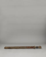 With this exquisitely created Ritual Sword with Brass Inlays, an exceptional artifact intended for ceremonial and spiritual purposes, one can admire the beauty and meaning of Tibetan craftsmanship. This one-of-a-kind sword, which measures 77 cm in height and 7.5 cm in width, is carefully constructed with a wooden base, covered in premium leather, and decorated with 90% silver highlights and delicate brass inlays. The sword is a compelling symbol of cutting through ignorance and barriers on the spiritual path and being an attractive decoration.