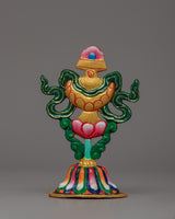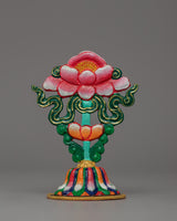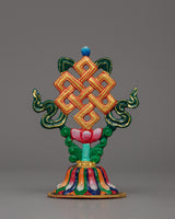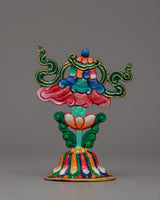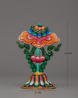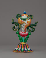 The exquisite collection of Tibetan ritual objects known as Sacred 8 Auspicious Symbols is hand-painted with colorful colors and made from brass. Each symbol has dimensions of 12 cm for height and 6 cm for width, with a 9 cm top width. The eight auspicious symbols in Tibetan Buddhism stand for essential facets of spiritual teachings and figures. The Lotus Flower represents purity, enlightenment, and spiritual growth, while the Endless Knot represents connectivity and unlimited understanding.