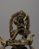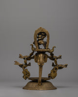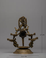 This ceremonial Sacred Brass Oil Lamp is a piece of art which serves as a cultural and religious symbol. The lamp, made of brass With Antique Finishing, has a tiered structure with many oil bowls to ensure a long-lasting and auspicious glow during rituals. Its exquisite design is crowned by a center deity or renowned figure surrounded by an arching halo, which represents divine transcendence. The lamp's arms extend outward, resembling delicately crafted animals that serve as sacred vehicles or protectors in Hindu and Buddhist religions.