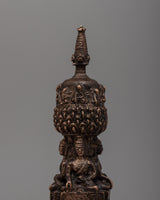 The stupa is an important Buddhist symbol that represents the Buddha's enlightened mind and the road to spiritual awakening. Its dome shape represents the universe, and the spire at the top represents the path to enlightenment. As a sacred item, the stupa functions as both a physical building and a spiritual vessel, symbolizing the Buddha's teachings and the desire for nirvana. The stupa's antique finish enhances its spiritual importance by connecting the present to years of Buddhist meditation and devotion. It is a valued object for meditation and prayer, providing a visual focus for contemplation on impermanence and the ultimate aim of enlightenment.
