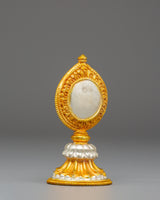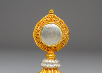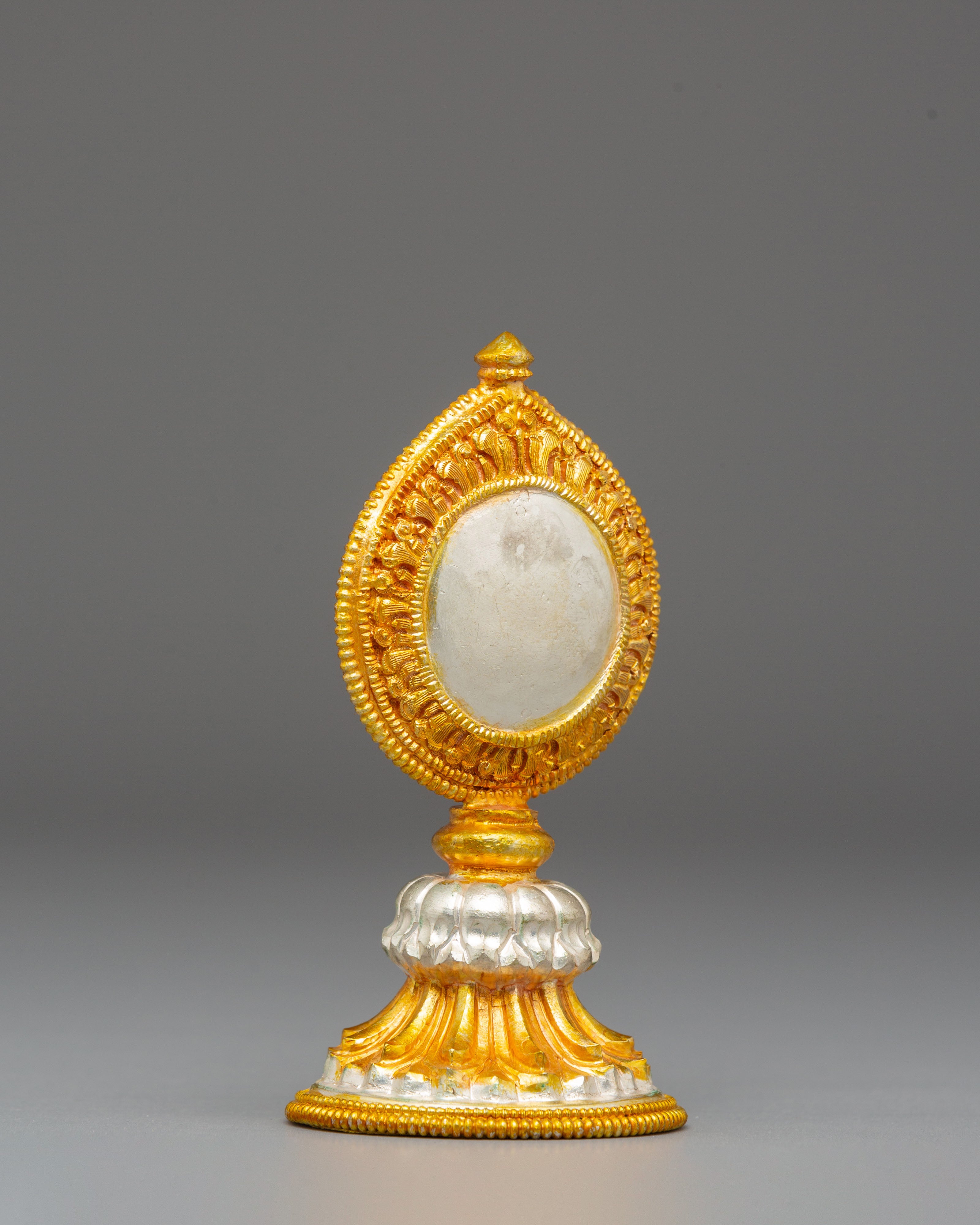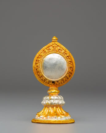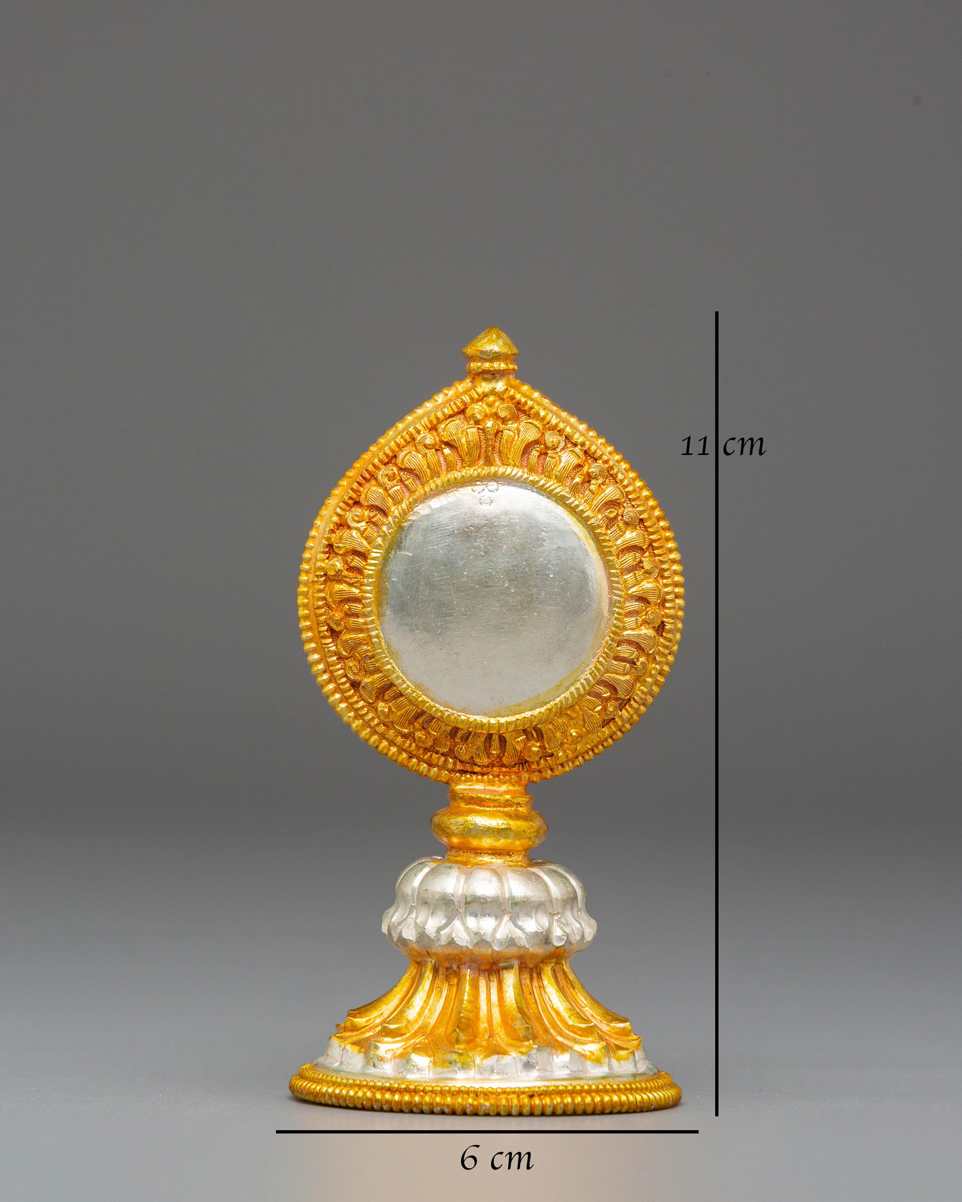 This sacred golden mirror is an exquisite Tibetan spiritual artifact that combines beauty and profound symbolism. Measuring 11 cm in height and 6 cm in width, this handcrafted mirror boasts a copper body with silver plating and mercury gold plating, creating a stunning effect that shines with both elegance and spiritual significance. Mirrors in Tibetan Buddhism are considered symbols of self-reflection and wisdom, representing clarity and the ability to see beyond illusions. This mirror serves as a powerful reminder of enlightenment and the importance of self-awareness on the spiritual path.