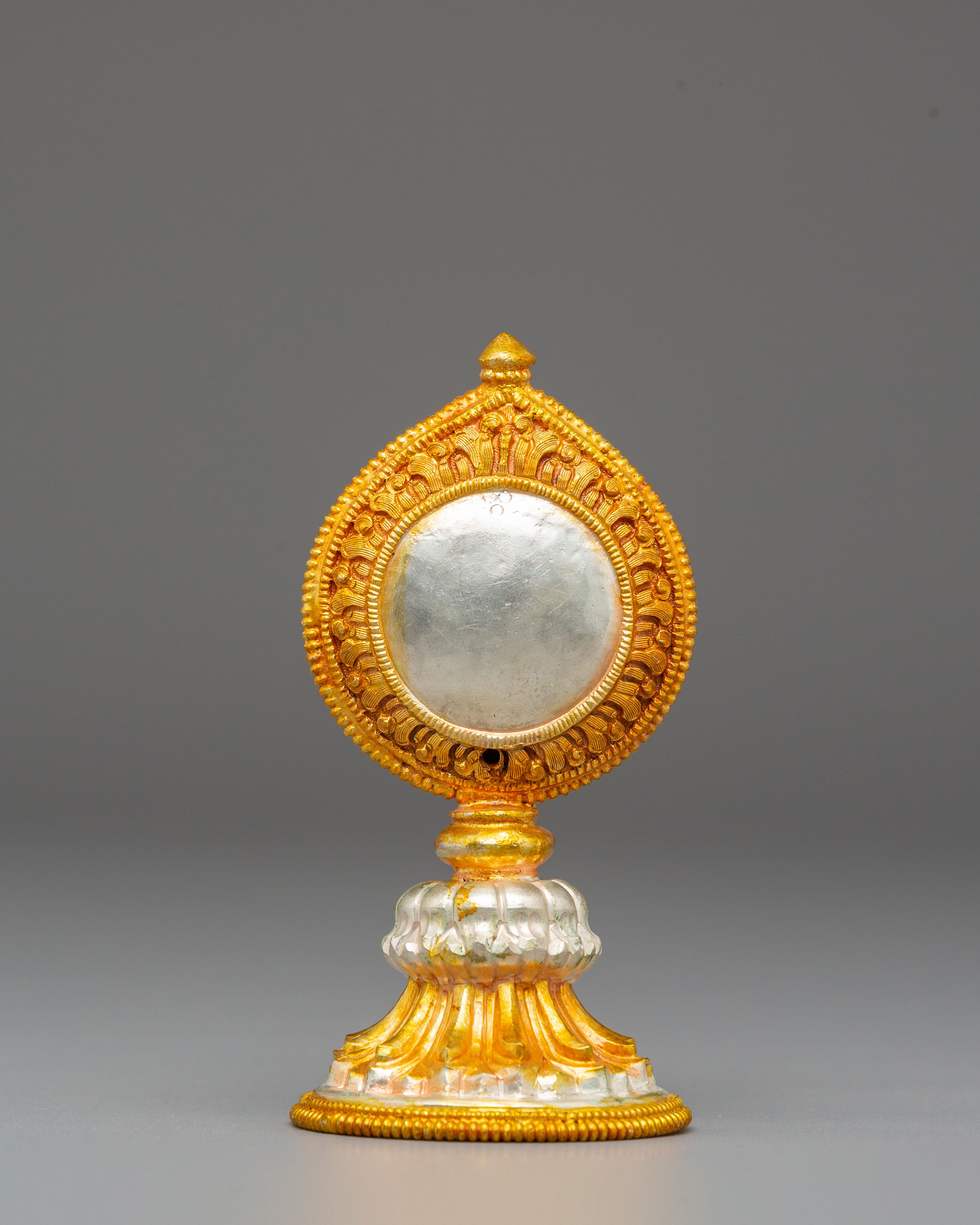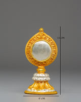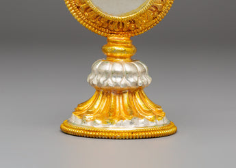 The intricate design of the Sacred Golden Mirror showcases traditional Tibetan craftsmanship. The gold-plated frame surrounds a reflective surface, while the silver plating enhances its spiritual significance. The base, beautifully crafted with detailed motifs, provides a foundation that symbolizes the balance between the material and spiritual realms. The copper body adds warmth and strength to the piece, further embodying the connection between physical and spiritual aspects of existence. The mirror is not only a practical object but a sacred tool for meditation and introspection.