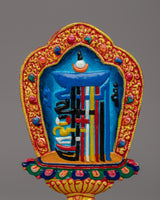 The Kalachakra, which means "Wheel of Time," is a complex idea associated with tantric teachings that symbolizes the complicated nature of time, cycles, and global harmony. The vertical script in the center of the image recalls the Kalachakra seed syllable, which incorporates multiple lines and colors to represent the unification of wisdom and compassion, as well as the interrelated nature of the cosmos. The crescent moon at the top and the vivid decorative frame complement traditional renditions of the Kalachakra mandala and teachings. Kalachakra is important to the Kalachakra Tantra, a profound meditation and philosophical system frequently associated with peace and conflict resolution. The rich colors and complex design of this artifact emphasize its ceremonial and symbolic significance.
