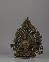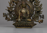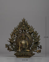 The Sacred Shakyamuni Buddha Statue is professionally created from high-quality brass and has an antique finish that contributes to its ageless beauty. This statue stands 23 cm tall and 21.5 cm wide, weighing 1.66 kg, making it a large and revered sculpture in any sacred setting. The brass body provides sturdiness and longevity, and the antique finish adds to the statue's spiritual aura, making it an ideal focus for meditation and reflection.